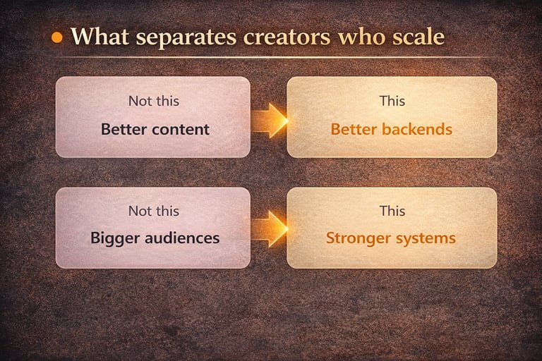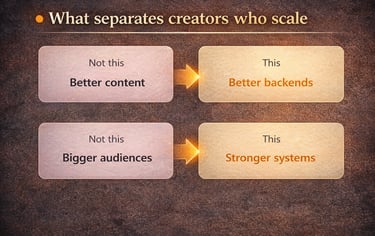 This isn't your fault. Nobody teaches creators how to build the infrastructure that creates leverage. You learned to create content, not architect operations. But without that foundation, growth just means more work.