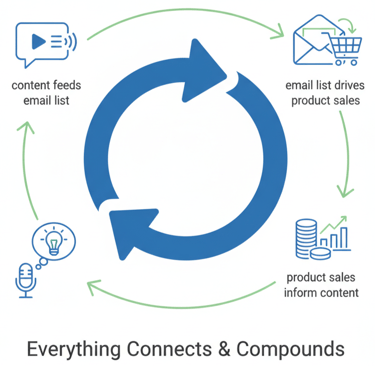 One action produces multiple outcomes. Your content feeds your email list. Your email list drives product sales. Your product sales inform your content. Everything connects and compounds.